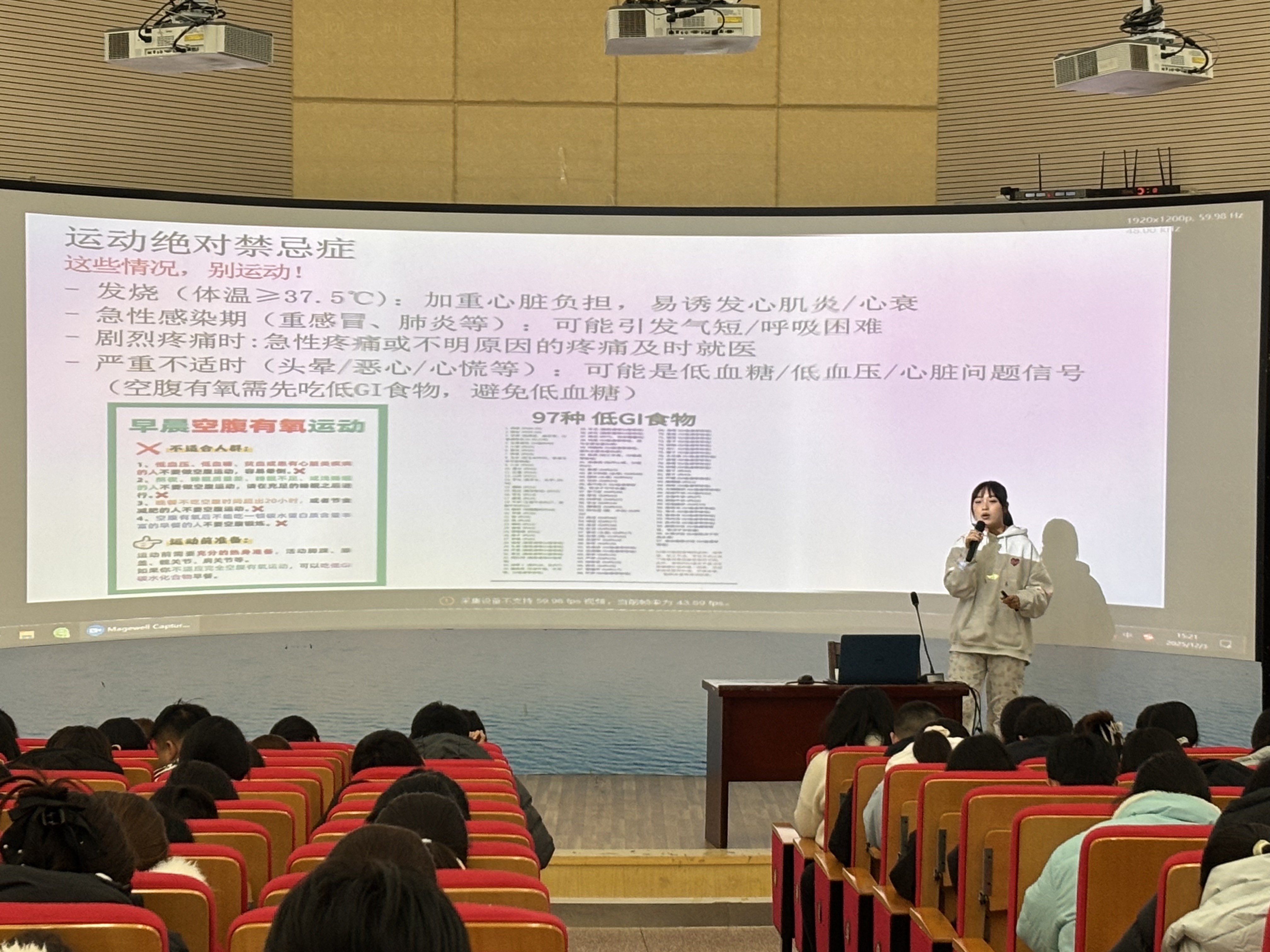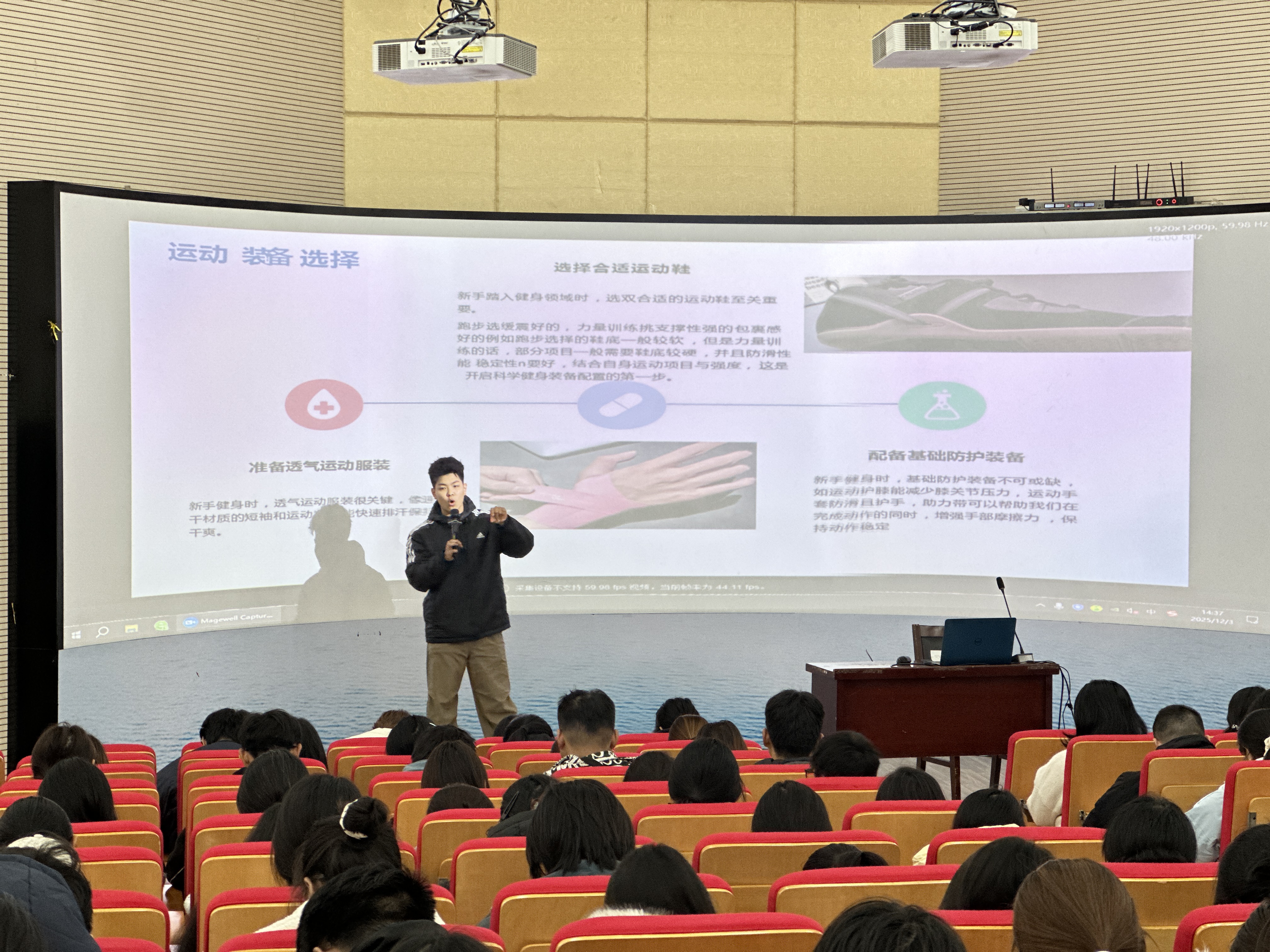 讲座伊始,李梦祥从科学健身基础角度切入,针对健身新手增肌、减脂的不同需求拆解训练方案,明确力量训练、有氧与力量结合训练的频次及饮食注意事项,并给出缓震鞋、支撑性训练鞋、透汗服装等装备选择建议,让听众快速掌握核心要点。