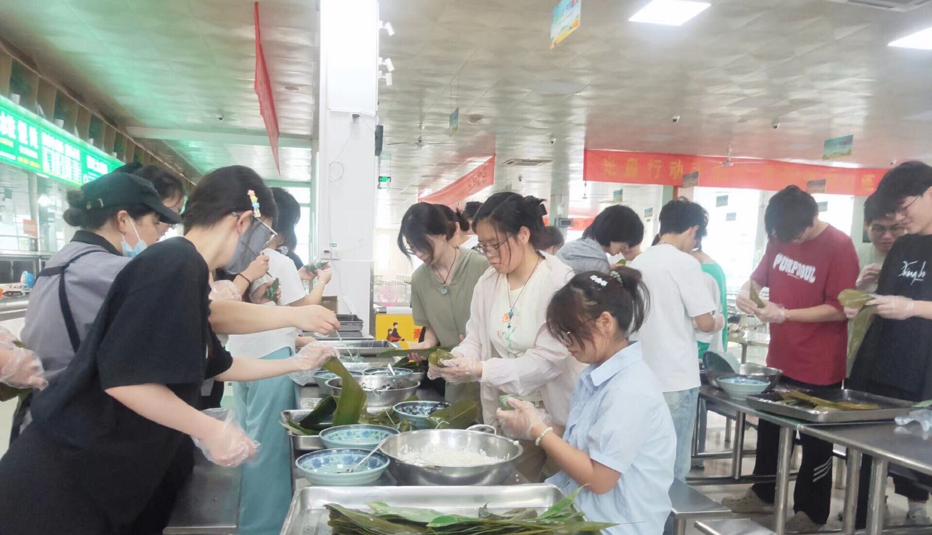 活动过程中,同学们互相交流,分享包粽子的技巧和心得。有的同学是第一次尝试包粽子,虽然手法略显生疏,但在食堂阿姨和同学们的鼓励下,很快就掌握了要领。现场欢声笑语,充满了温馨和谐的气氛。