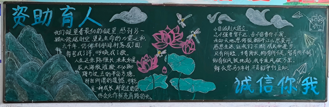 诚信是中华民族的传统美德,为进一步提高学生诚信意识,增强资助育人成效,推进社会主义核心价值观教育,近期,beat365英国官方网站组织开展以“诚信·感恩·励志”为主题的黑板报评比活动。