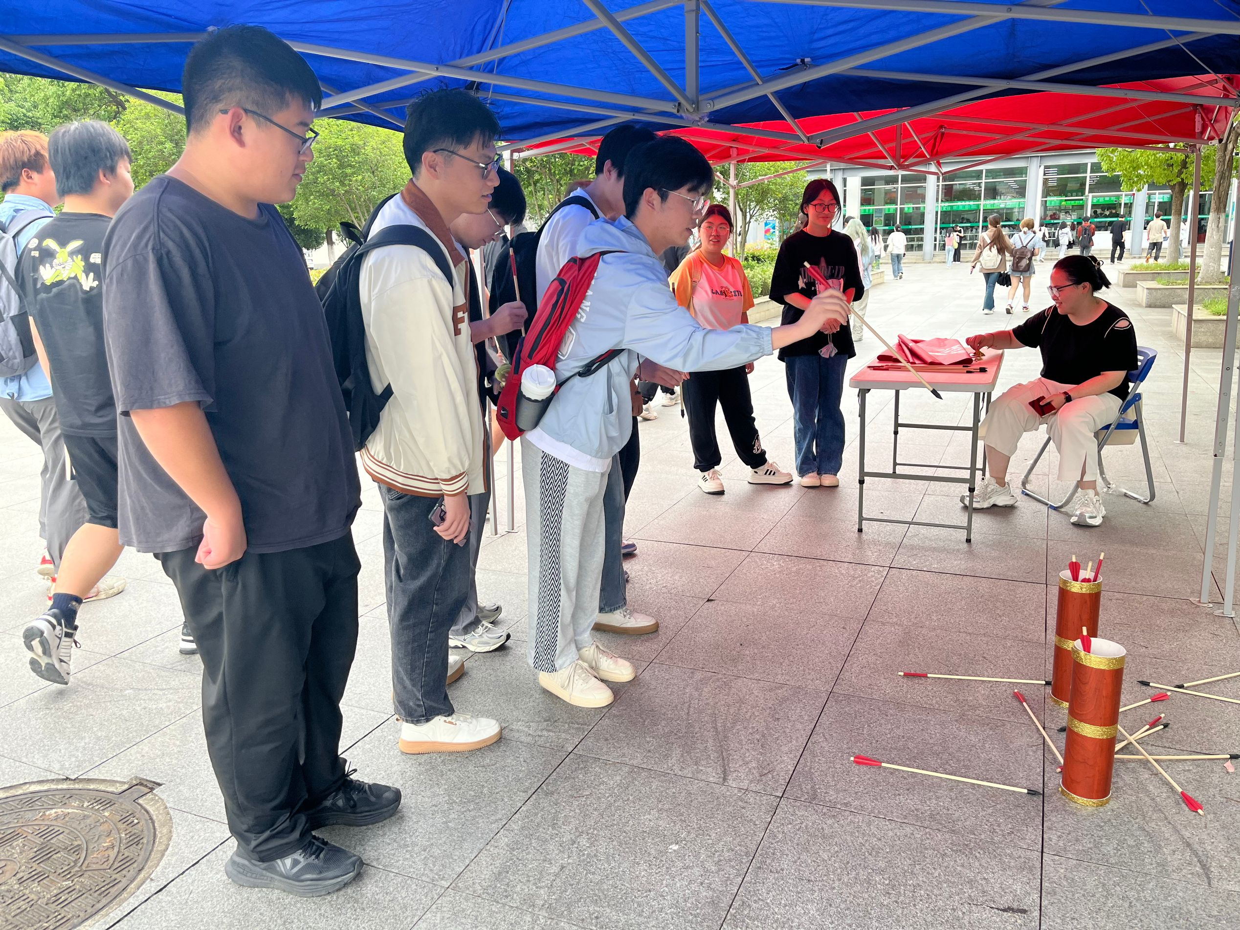 粽叶飘香迎端午,投中壶中相思情。舒窈职业礼仪社趣味投壶活动在一食堂对面吸引大量学生的热情参与和围观。同学们踊跃参加,积极尝试,现场氛围欢欣热烈。参与的同学激情澎湃,喝彩声回荡在整个场地。社团还为参与投壶的同学准备了五彩绳作为奖品,生动展示了我国传统文化习俗,营造了浓厚的端午节氛围。