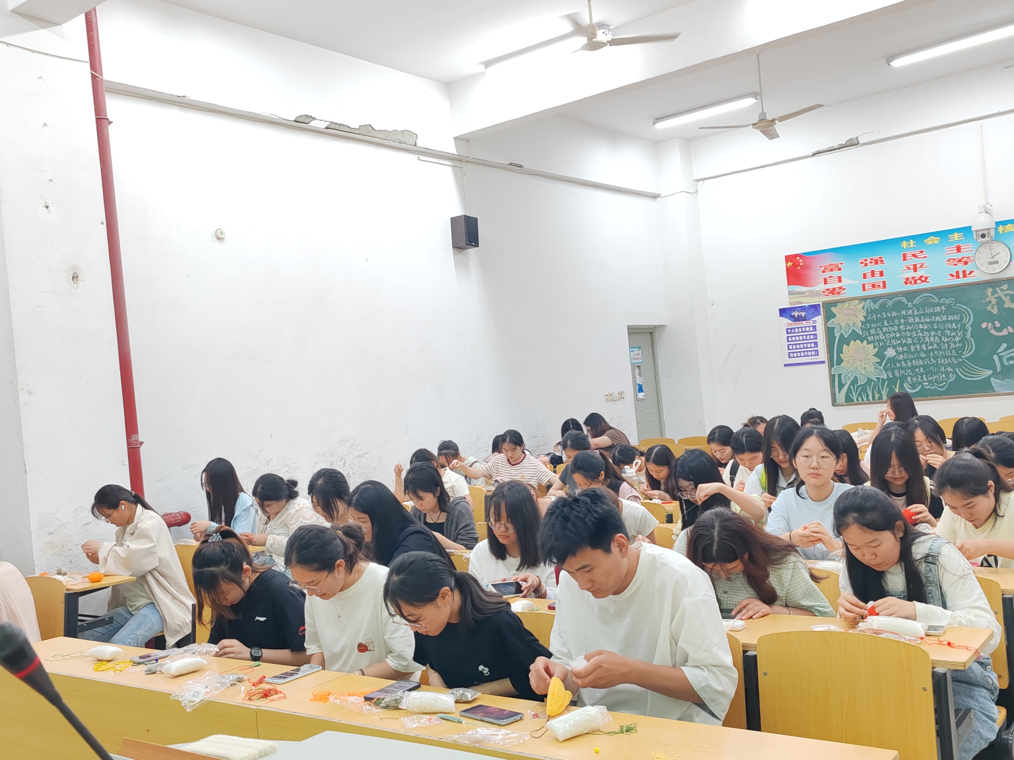 彩线轻缠红玉臂,小符斜挂绿云鬓。学而社的同学们在D栋教学楼热烈开展五彩祈福,纳吉端午手工活动。社团内外五十多名同学现场制作代表着祈福纳吉的五彩绳,感受端午结绳互赠的风俗与文化。