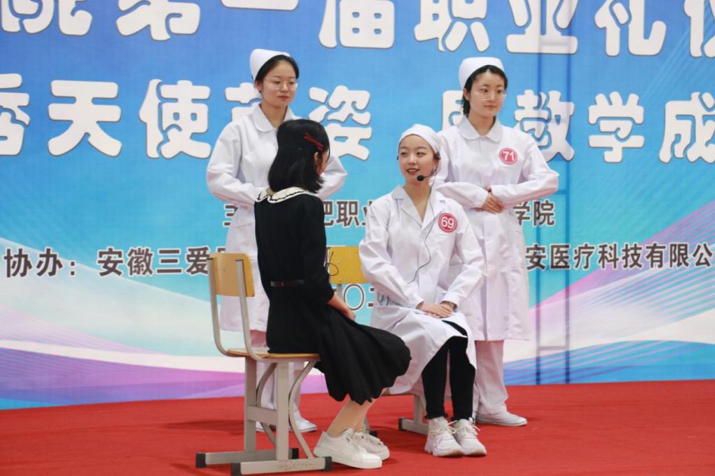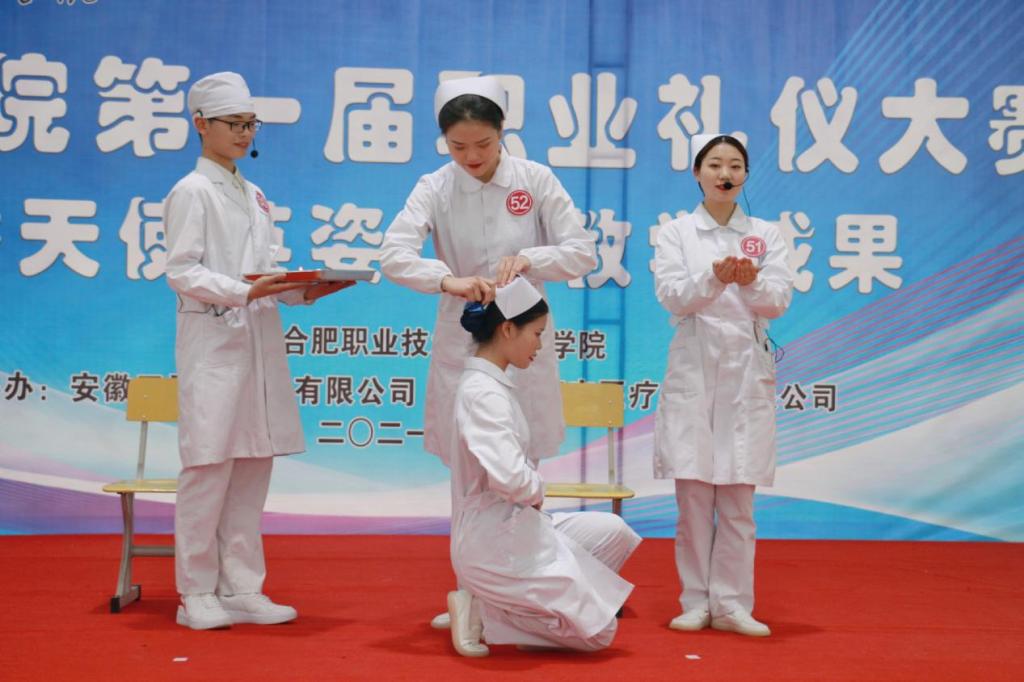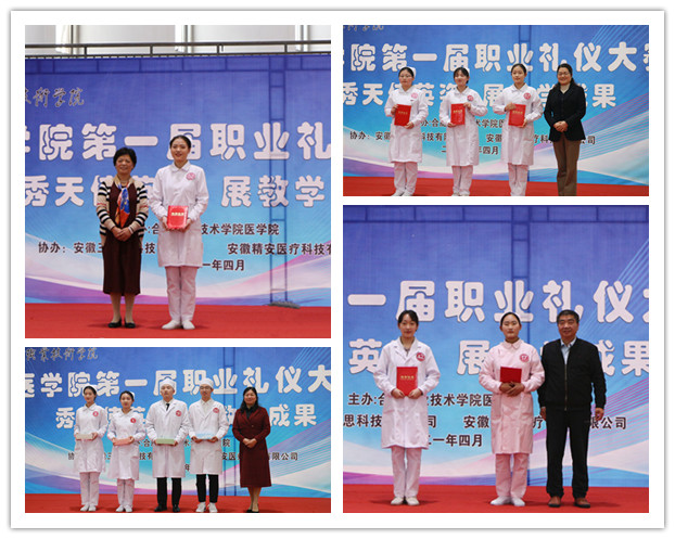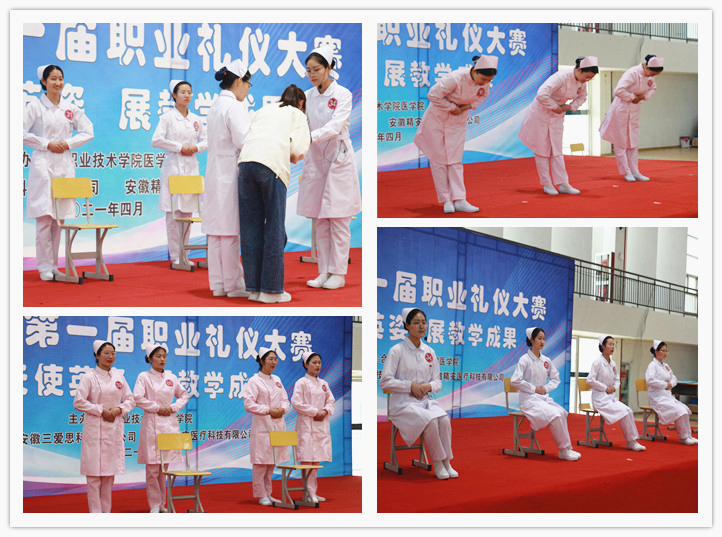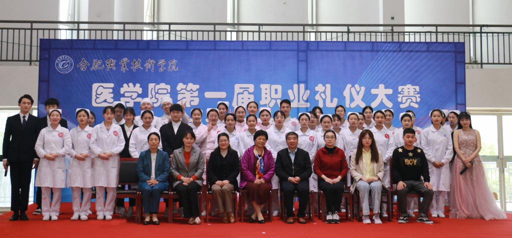 为了落实“五育并举”,推进“三全育人”工作,增强beat365英国官方网站学生专业素养和就业自信,展现学子的职业精神风貌和礼仪风采,2021年4月21日下午在学校体育馆二楼举办beat365英国官方网站职业礼仪大赛,安徽医科大学附属巢湖医院副院长、巢湖市护理学会理事长孙会芹,合肥职业技术学院校党委委员、鼓山校区管委会主任周泽山,马克思主义学院院长靳玉琼、beat365英国官方网站党政班子和相关专业教师应邀出席了本次比赛,并担任评委老师。
