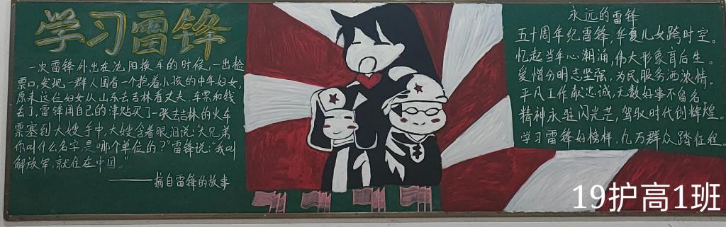 活动期间各班精心准备、查找资料、设计样式,用优美生动的文字图画、充满创意的色彩搭配,对雷锋的先进事迹进行了全方位的介绍。有的介绍雷锋生平,有的宣传雷锋感人事迹,有的再现雷锋日记,有的收集雷锋名言,内容丰富,形式多样,图文并茂,各班设计的板报新颖独特,既弘扬了雷锋精神,又赋予其时代精神。