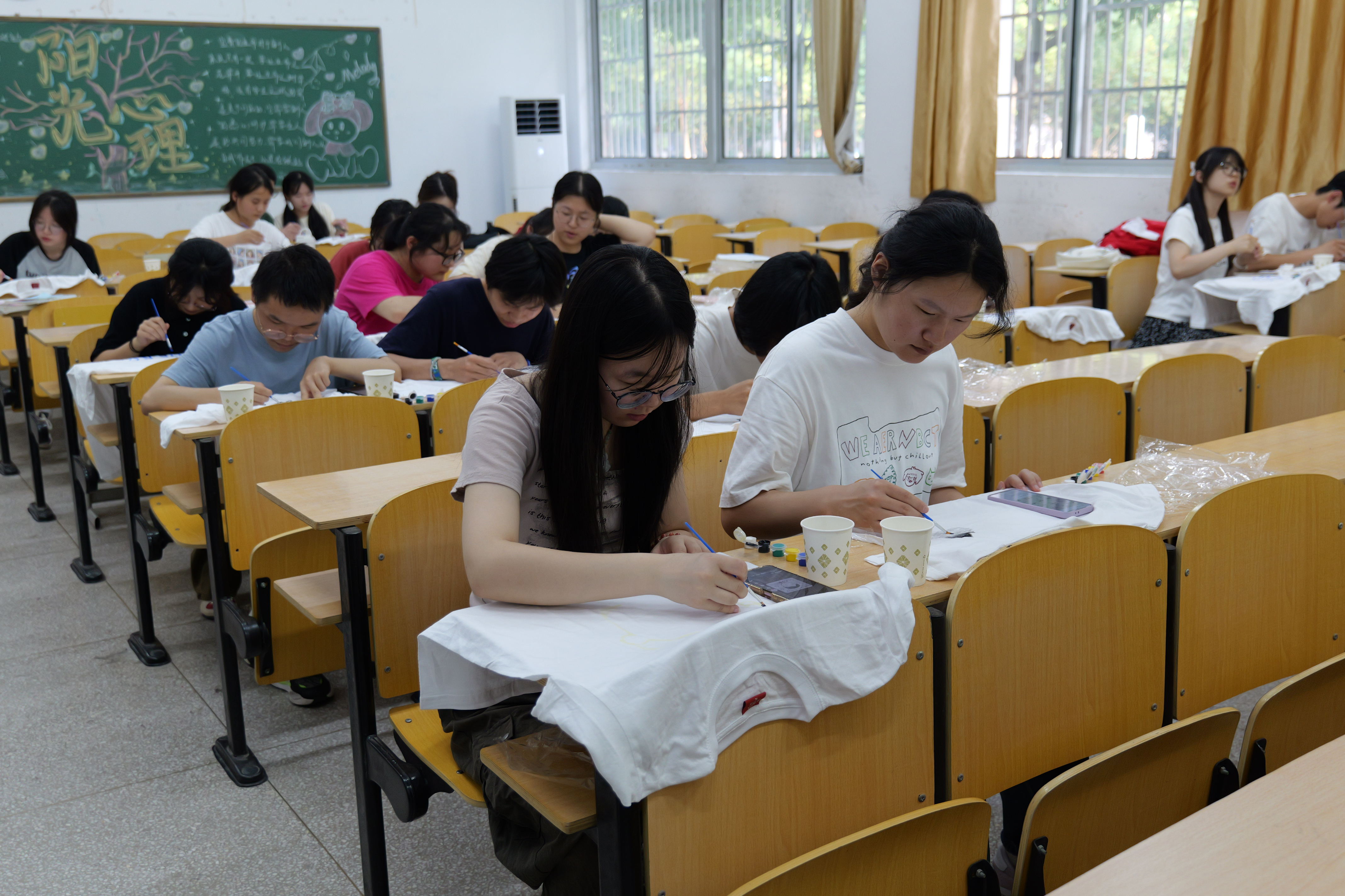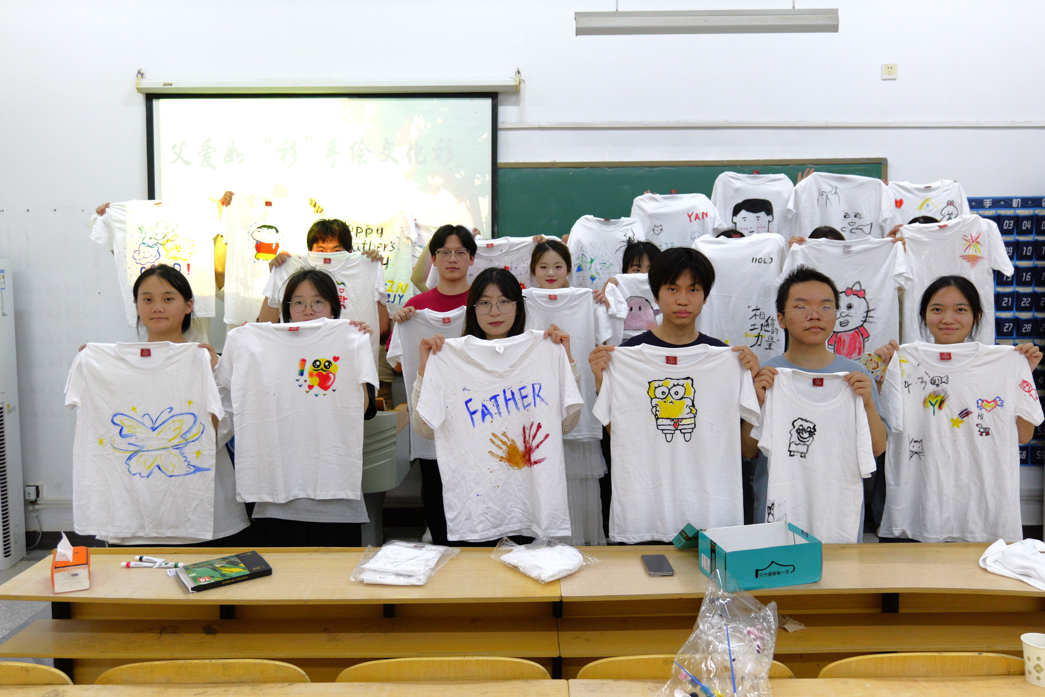 活动开始前,社团负责人叶童向大家介绍了父亲节的来历和寓意。活动现场气氛欢快,白衫做底,大家或写字或手绘,互相交流创意构思、颜色搭配,细心勾勒轮廓,认真填充色彩,每个环节都一丝不苟。一件件白色的T恤被绘上了可爱的图案和美好的祝福,一幅幅作品栩栩如生,表达了对父亲的无尽感恩和爱意。