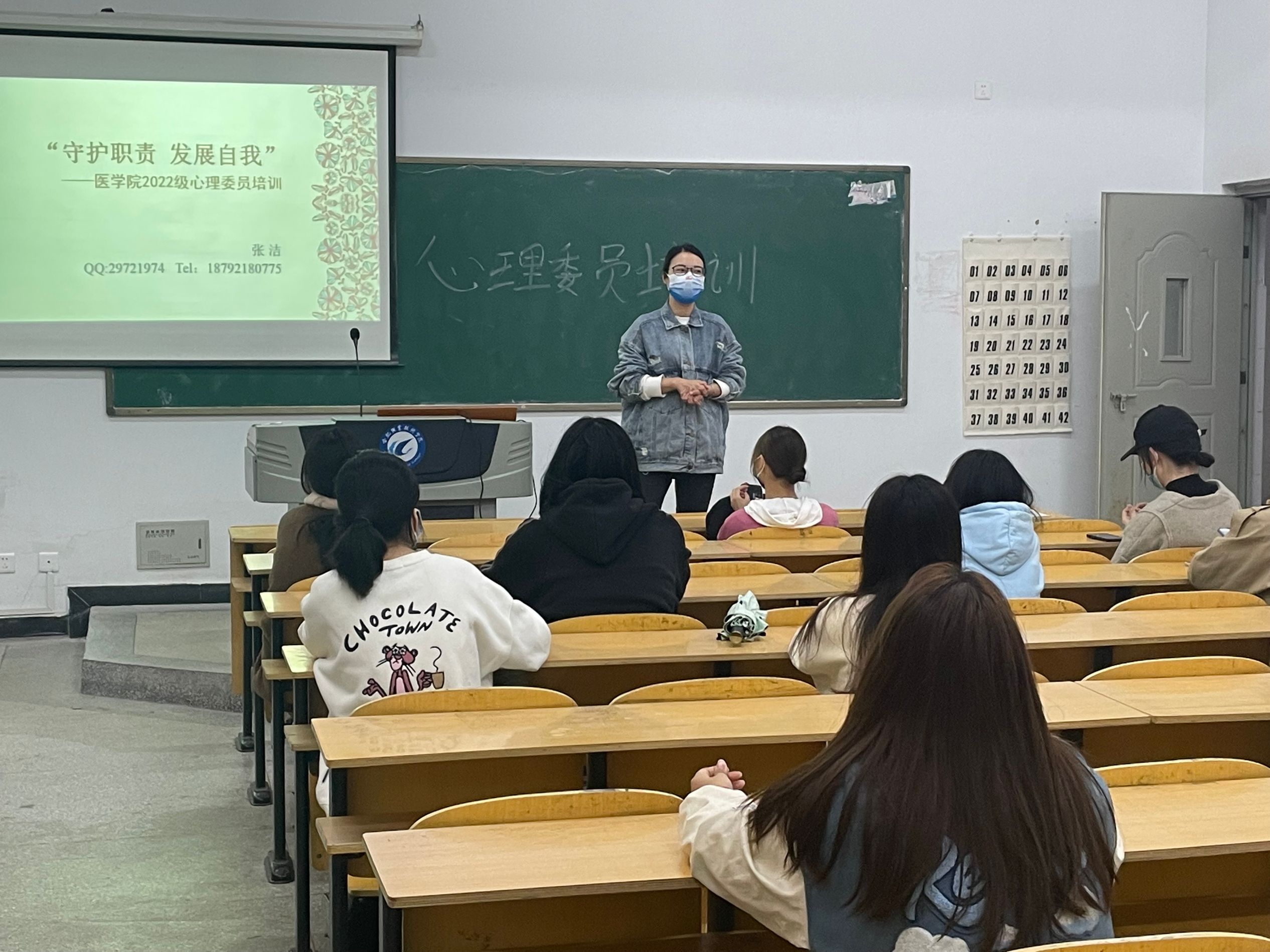 本次培训围绕“守护职责、发展自我”的主题从两大方面展开。首先,张洁老师通过介绍相关健康知识以及如何识别各种心理问题,引导学生积极树立“三个意识”、培养五种能力,做一个心理健康的人。然后,张老师围绕学习心理委员的工作职责、具体工作要求和注意事项,充分发挥心理委员的宣传与教育、联络与反馈功能,在组织开展班级活动、协助老师、关心帮助同学的过程中不断自我成长。