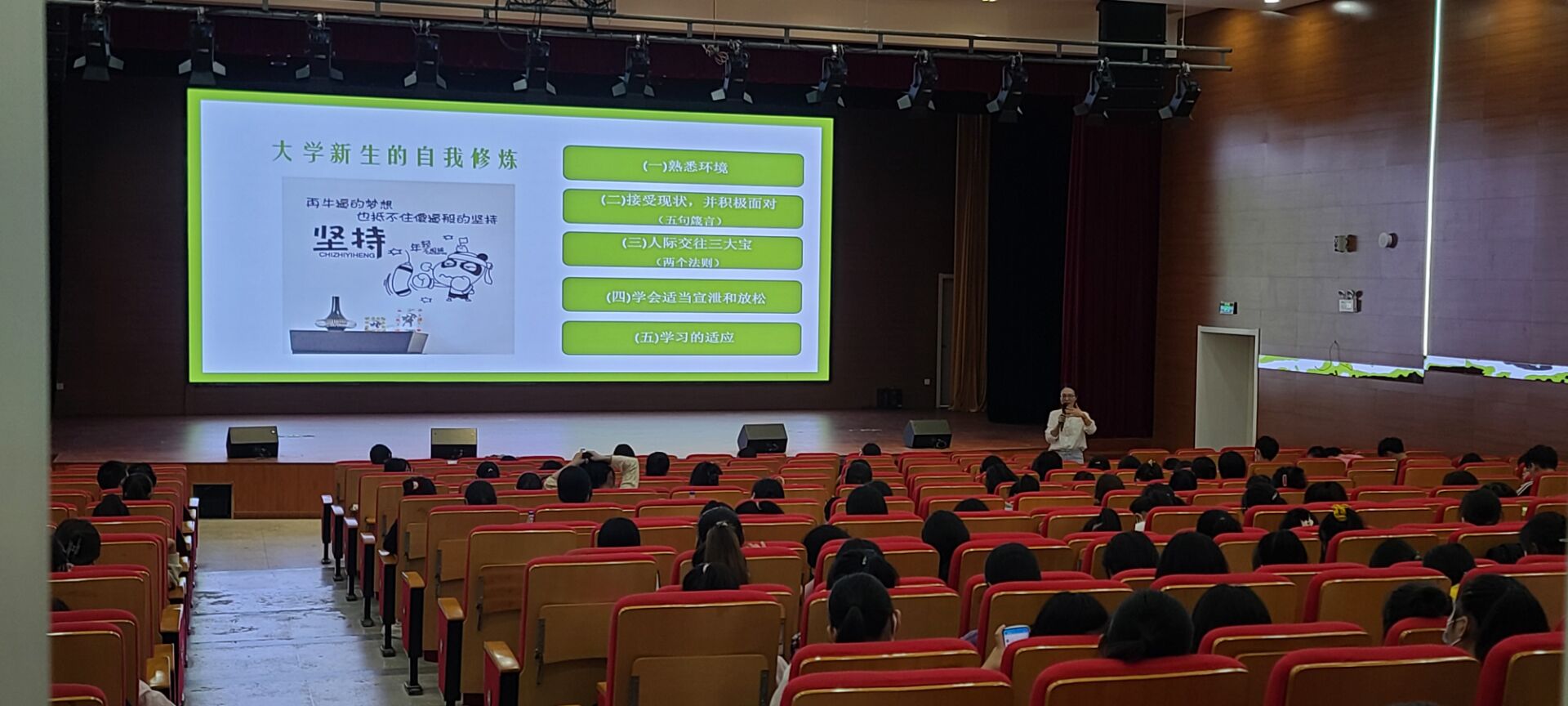 讲座从新同学们可能会遇到的一些问题和困惑切入,着重分析了大学新生如何完成“环境、学习、人际”三大适应,引导大学生积极树立“尊重心态、成人心态、归零心态、规划心态”四种心态,适应新生活,谋求新发展,积极完成适应期的心理调适。
