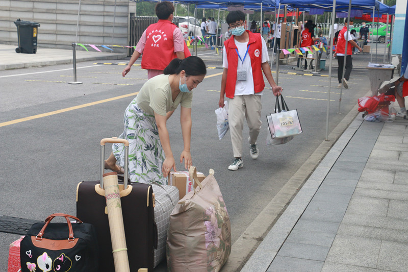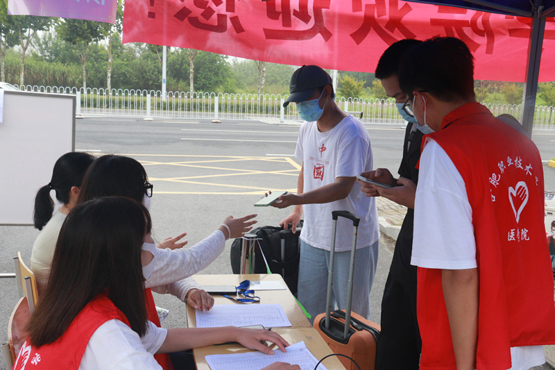 清晨7点,beat365英国官方网站迎新工作人员在学校大门东门准备就绪,等待新生的到来。新生们来到校门口,在“一米线”间隔排队,经查验录取通知书后,先后进行安康码核查是否绿码、疫苗接种与否、14天行程有无异常、核酸检测报告是否阴性等信息核验、测额温、行李与手消毒、更换口罩、信息登记等多个环节。在志愿者的引导下,报到现场井然有序。