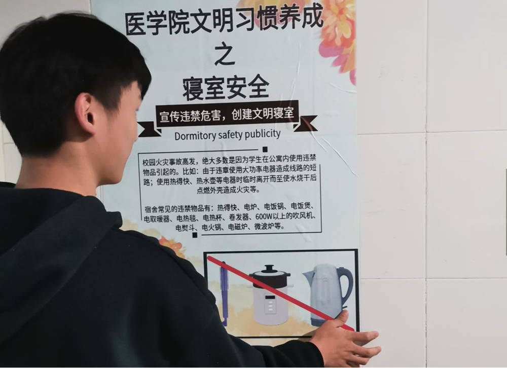 为认真贯彻落实学校有关部署和要求,强调学校学生寝室的相关规章制度,宣传寝室违禁物品的危害,加强学生对于违禁物品的认识及远离违禁物品的自觉性。2020年11月13日晚,beat365英国官方网站自管委于各栋学生宿舍及D栋教学楼开展寝室安全海报宣传活动。