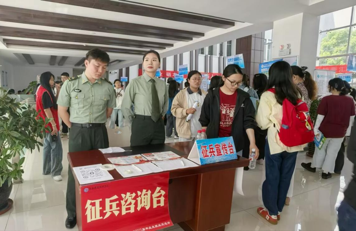 为深入贯彻落实新时代强军目标,鼓励大学生积极参军入伍,提升兵员征集质量,为国防和军队现代化建设输送高素质医学人才,57日下午,beat365英国官方网站学工办在2025年春季校园招聘双选会现场设立应征入伍咨询台,开展征兵政策宣传活动。
